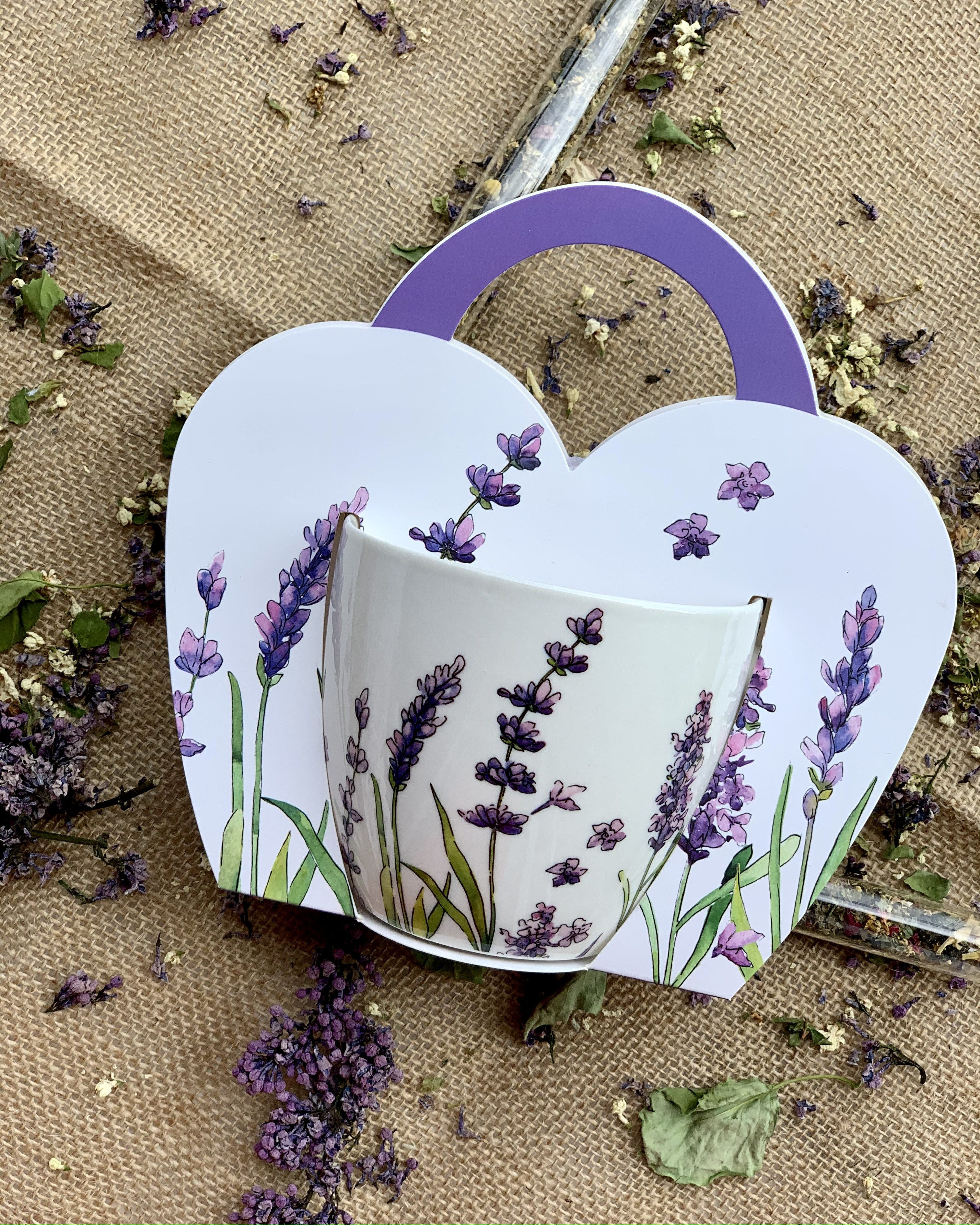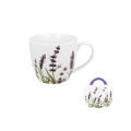 Elegantna skodelica, z prostornino 460 ml z motivom vijolične lavande. Kremno bela barva z nežnim sijajem, lahka in vzdržljiva. V dekorativnem nosilu, idealna za čaj, kavo ali kot izvirno darilo.