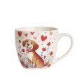 Posebnost skodelice je prikupen motiv veselega psa na cvetočem travniku, obdanega z lebdečimi rdečimi srčki. Romantičen dizajn ustvarja toplo in srčno vzdušje, zato je skodelica popolna izbira za valentinovo, obletnice ali kot pozornost za nekoga posebnega.